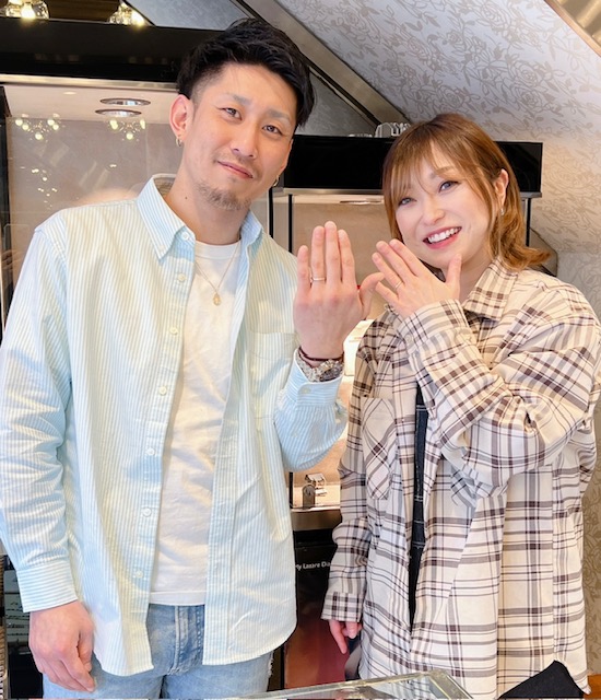 奥様のリングの中央には可愛らしくさりげなくダイヤモンドがあしらわれ、華やかな奥様にとてもお似合いです。
