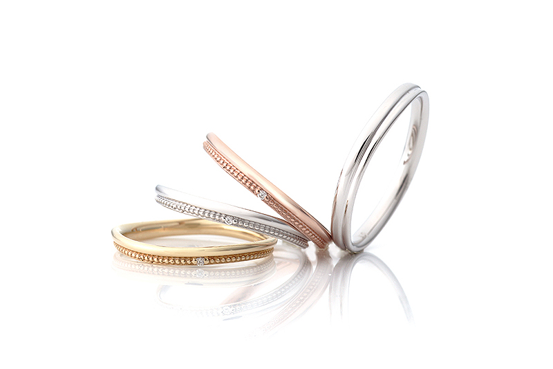 好みに合わせて6種類のうちからお好きな素材で、また、カラーダイヤや誕生石など自由にチョイスできるのでおふたりらしいアレンジをお楽しみいただけます。